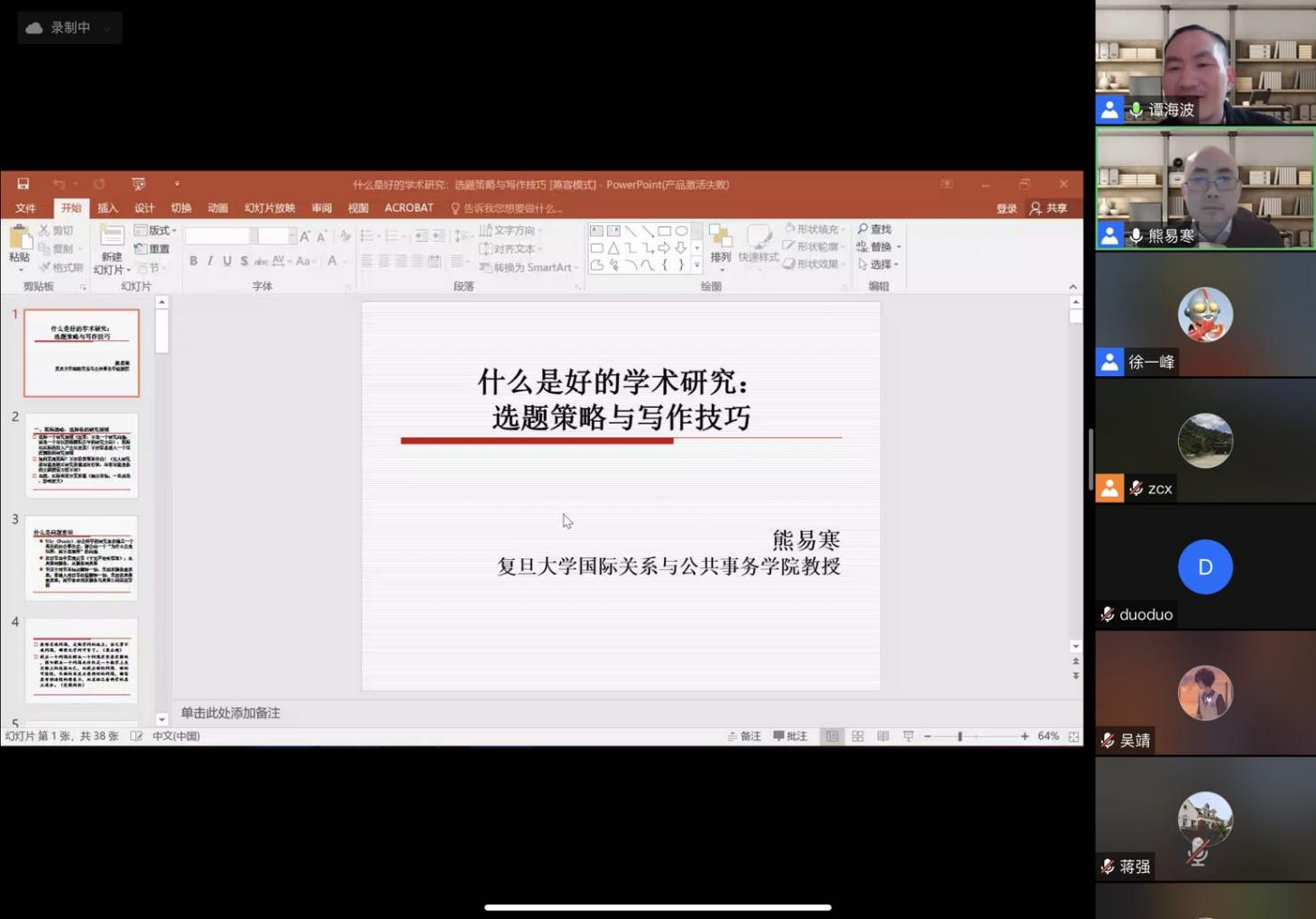 2021年11月12日晚七点半,由bv伟德官方网站MPA教育中心和bevictor伟德官网研究生会联合承办的2021年第四期bv伟德官方网站公共管理研究生论坛通过腾讯会议顺利举办。复旦大学国际关系与公共事务学院副院长、教授熊易寒受邀担任本场活动的主讲人,做了题为“什么是好的学术研究?——社科论文的选题策略与写作技巧”的学术讲座。bevictor伟德官网副院长谭海波教授担任讲座主持人,参会师生共400余人。