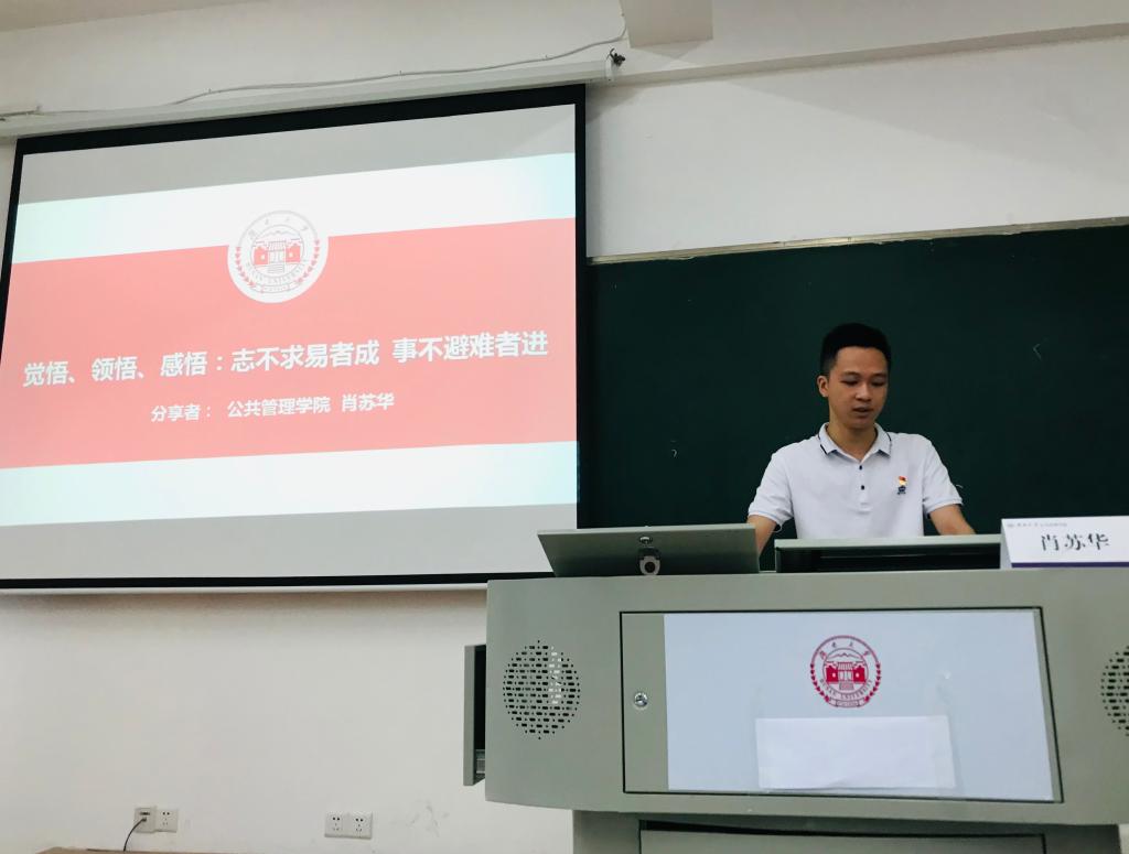 会上,肖苏华阐述了自己的入党初心以及向党组织靠拢的政治觉悟。紧接着,他以自己的志愿服务经历与实践调研经历号召研究生党员们应当积极投身社会实践,锤炼党员初心使命。随后,他结合支部工作实际提出,作为一名党支部宣传委员,要推动支部理论学习,争当表率,一以贯之。此外,还要加强支部活动宣传,及时发声,注重实效。最后,他用俗语“有志事易,无志事难,知难不畏,绝壁可攀”进行了总结,勉励在场的研究生党员们继续在学思悟践中坚定理想信念,在奋发有为中践行初心使命,不负青春、不负韶华、不负时代,秉承“实事求是、敢为人先”的校训,书写砥砺奋进的青春篇章。