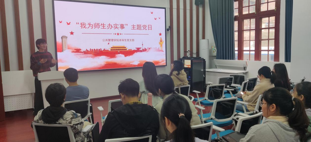 随后,支部党员张博远、鲁家琪、常铖、华蕾、王雪楠、刘思逸等同志依次分享了这一年里为学院同学、老师所办的实事。其中,王雪楠同志作为校学生会主席团成员分享了其从事学生权益工作的经历,从组织各级学生会收集学生权益提案到跟踪反馈各部门权益问题落实情况,在诸如解决校园网问题、大科城公交班次问题等关乎师生生活实际问题上做出了自己的贡献,以实际行动践行“我为师生办实事”。