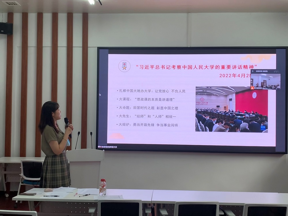 史钰宏同志首先领学了4月25日习近平总书记在中国人民大学讲话精神,结合专业的学习与研究希望各位同志自身的研究能够“回答时代之题”、“彰显中国之理”。随后,支部组织委员陈雪莹将其与2020年9月总书记考察我校的重要讲话精神相结合,带领同志们回顾了总书记对我校同学们的期望与祝福。最后,支部成员围绕总书记对青年们“不负青春、不负韶华、不负时代”的要求,如何系好人生第一粒扣子等问题展开了讨论。