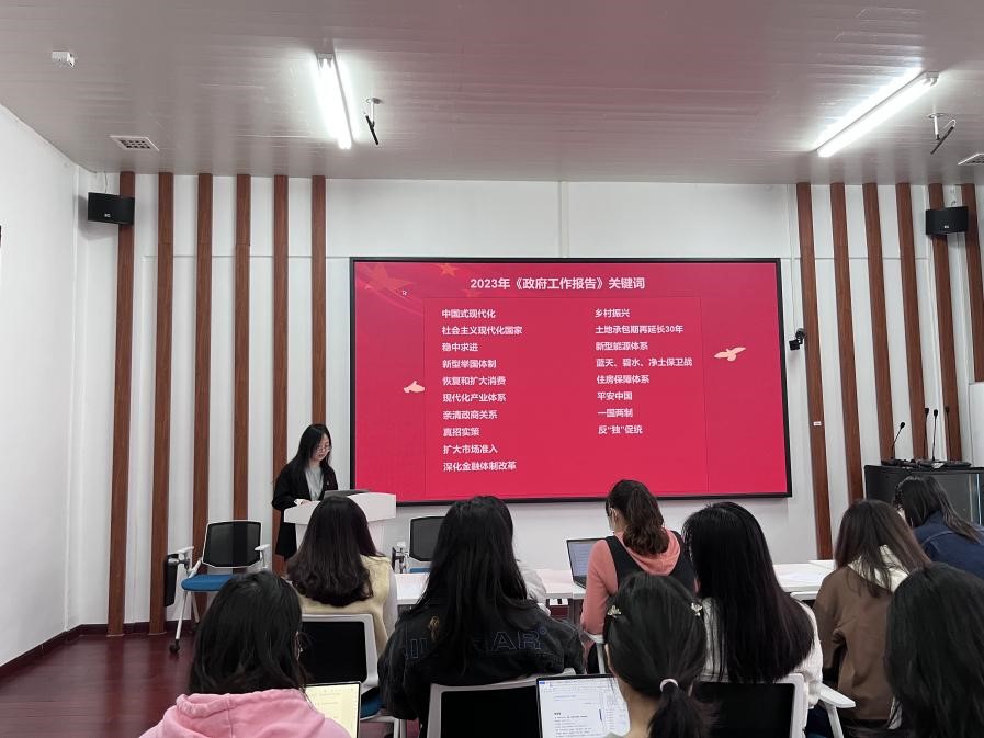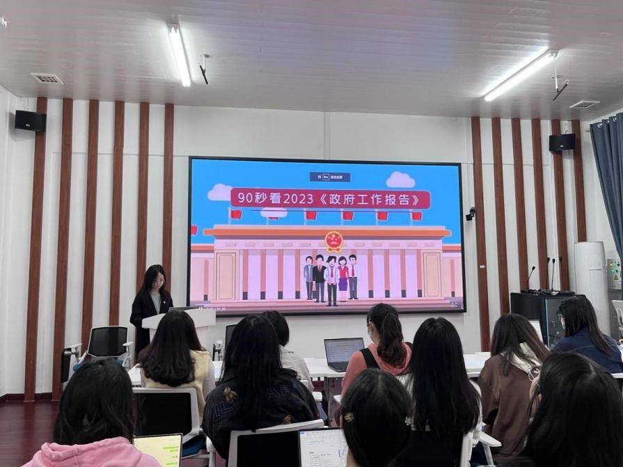 支部书记曹丽康作为党课的主讲人,带领与会同志观看2023年《政府工作报告》微视频,聚焦《中国政府报告》关键词,回顾了政府过去五年在经济发展、民生福祉等领域取得的瞩目成绩。与会党员学习热情高涨,对政府报告中提出的未来发展预期目标充满信心和期待。支部书记曹丽康也鼓励支部同志奋斗新征程,奉献公管学生党员的力量。