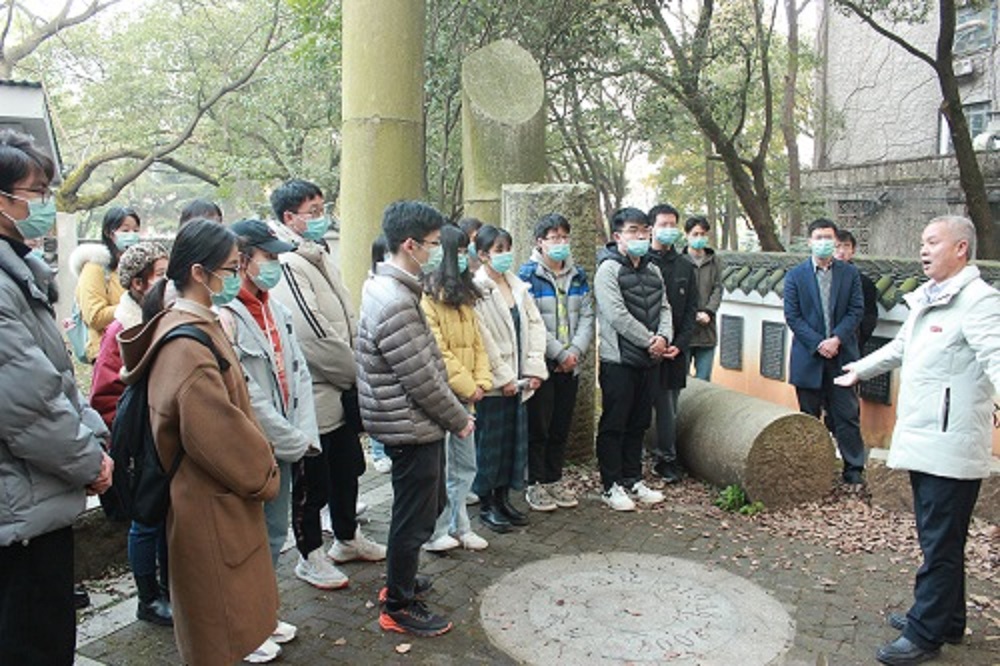 随后,大家跟随龙兵教授的脚步来到bv伟德官方网站图书馆遗址。bv伟德官方网站图书馆毁于1938年的日军轰炸的炮火中,至今仍能依稀看到石柱上的弹痕。断壁残垣又浩气长存、华屋丘墟却又文脉永续。矗立此处的两根石柱,唤起了这座千年学府曾遭受战火的记忆,一段不屈的岁月,一段bv伟德官方网站文脉永续的见证。龙兵教授为大家讲述了日军侵华的历史,共同追忆了那个战火纷飞年代里湖大师生的血性担当。日军轰炸虽炸毁房屋,但是炸不毁千年文脉和bv伟德官方网站师生同仇敌忾之心。龙教授强调这段屈辱历史不能忘却,全校师生在办学中抗战、在抗战中办学的爱国热忱、自强不惜、团结奋斗的精神不容忽视。新时代的青年学子应当高举爱国主义旗帜,不忘历史、努力学习,肩负起时代的使命与担当,将青春力量谱写在新时代伟大征程之中。