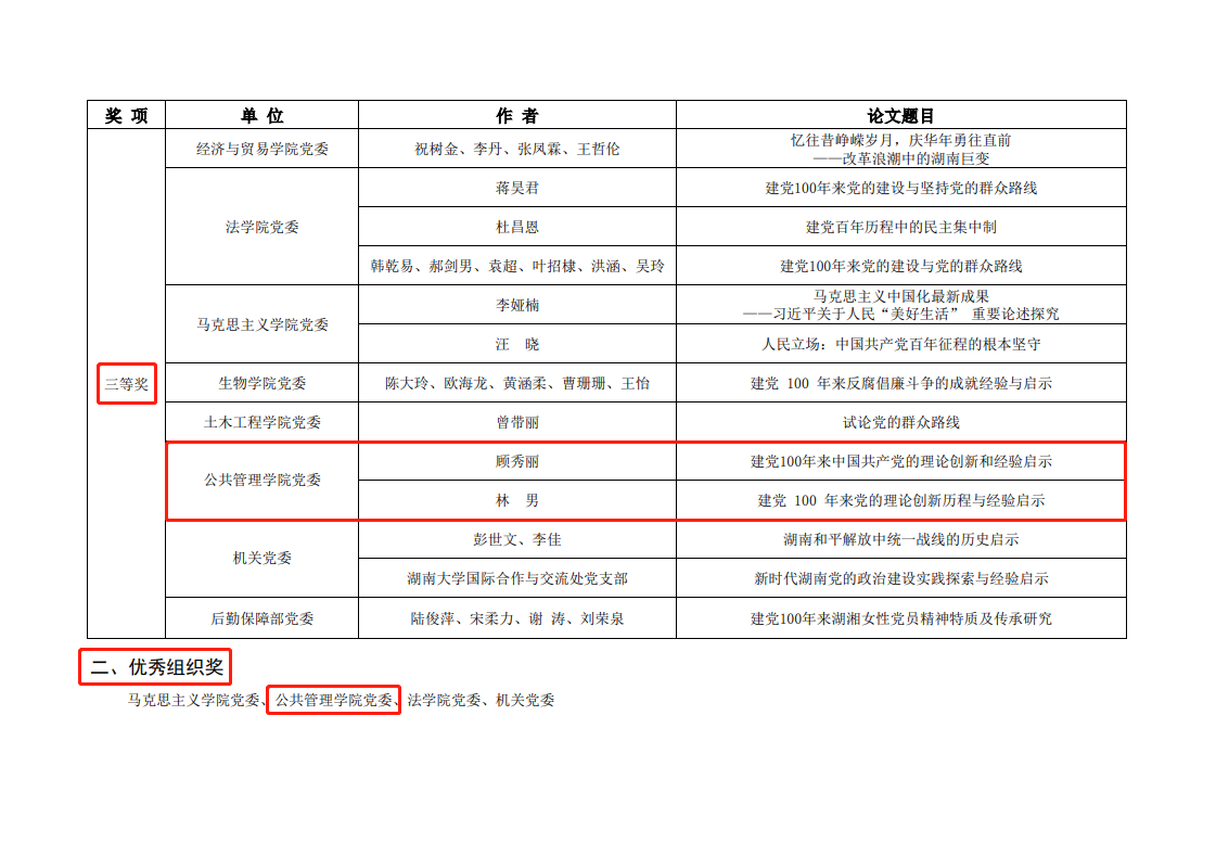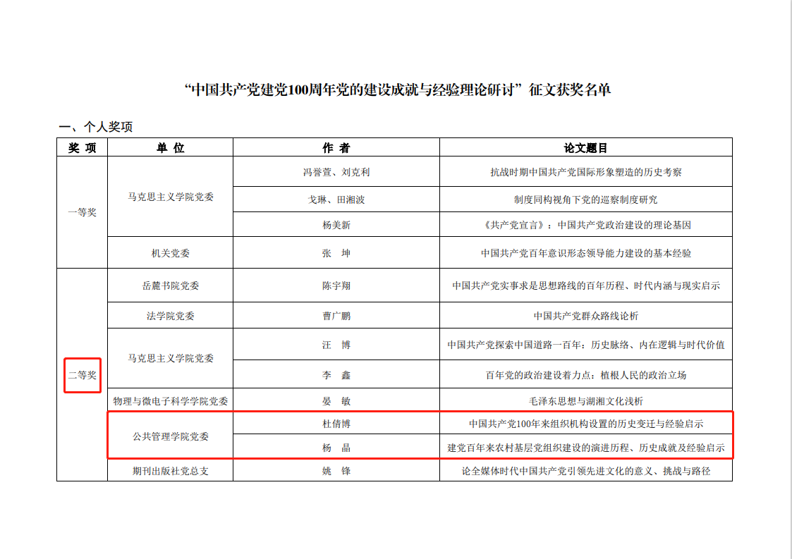 经学校专家评审, 学院党委副书记杜倩博的《中国共产党100年来组织机构设置的历史变迁与经验启示》、公共政策研究联合党支部教师杨晶的《建党百年来基层党组织建设的演进历程、历史成就及经验启示》均获二等奖,2019级硕士研究生党支部顾秀丽的《建党100年中国共产党的理论创新和经验启示》、2019级硕士研究生党支部林男的《建党100年党的理论创新历程和经验启示》均获三等奖。bevictor伟德官网荣获优秀组织奖。