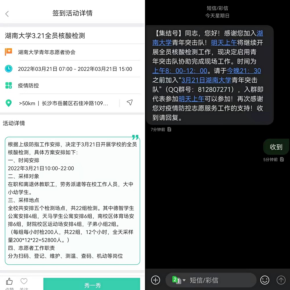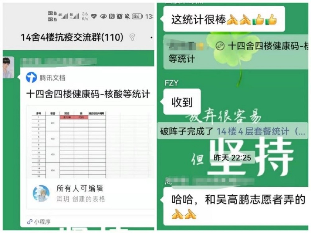 事迹1:bevictor伟德官网2020级硕士研究生吴高鹏加入”校院研究生会疫情防控突击队“。3月27日开始投入bv伟德官方网站学生互助文档值班,累计排查、核对、回复、上报信息140条。他还担任志愿者协助楼层负责人,先后完成四楼健康码-核酸统计在线共享文档设计工作,一小时内紧急排查所在楼层109人健康码、核酸检测实施情况,并负责所在楼层三个红码黄码寝室,三餐带饭工作。