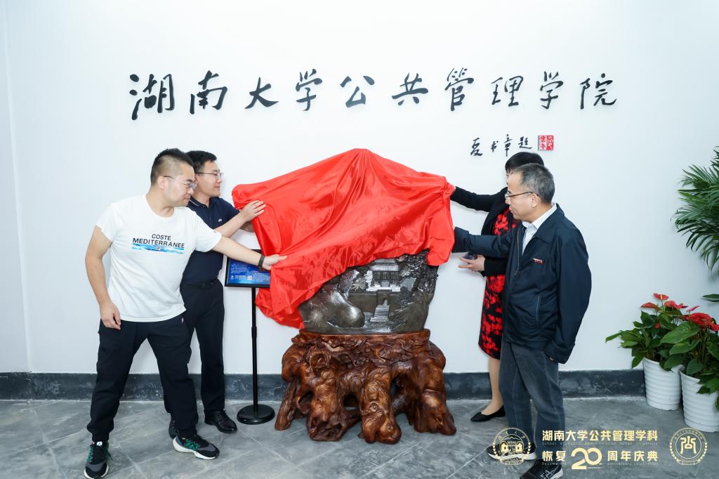 在学院门厅夏书章先生题字前,付蓉芬书记、李金龙教授与2004级研究生校友代表刘明然、2001级本科生校友代表张俊峰共同为“岳阳楼记”菊花石揭彩。刘明然表示,“岳阳楼记”菊花石雕刻蕴含的忧国忧民情怀与bevictor伟德官网人才培养理念比较一致,捐赠菊花石表达的是校友对学院培养成才的深厚感激之情,也代表着校友对学院未来发展的支持和祝愿,希望学院能够在人才培养和学科发展方面再上新台阶。