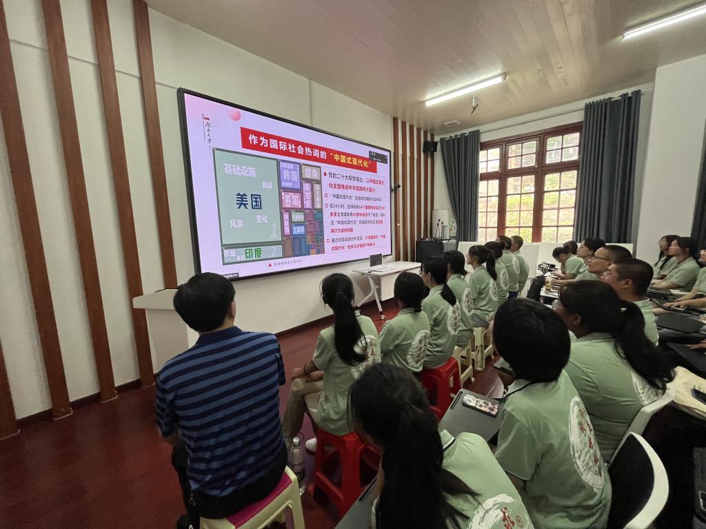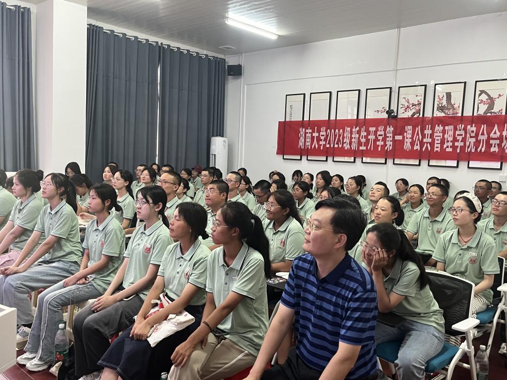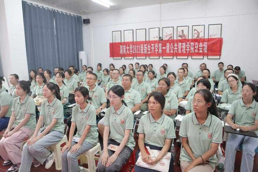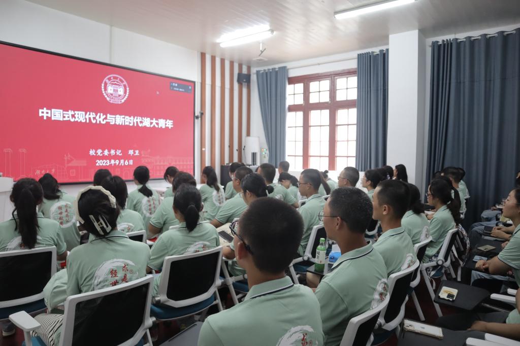9月6日下午,bv伟德官方网站党委书记邓卫老师为全体2023级本科新生讲授了一堂主题为“中国式现代化与新时代湖大青年”的开学第一课。bevictor伟德官网15名23级本科新生代表前往bv伟德官方网站大礼堂主会场集中聆听,其余新生于bevictor伟德官网院楼220与221教室分会场观看直播。bevictor伟德官网党委副书记杜倩博老师、辅导员胡春晖老师出席并一同收看直播。