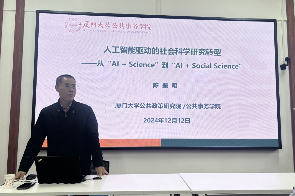 12月12日下午,国家高层次人才、厦门大学公共事务学院创始院长陈振明教授应邀做客我院公共管理名家岳麓论坛,以“人工智能驱动的社会科学研究转型”为题作报告。论坛由我院副院长雷玉琼教授主持。