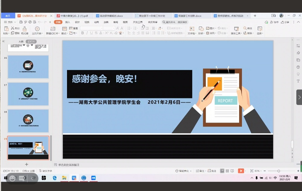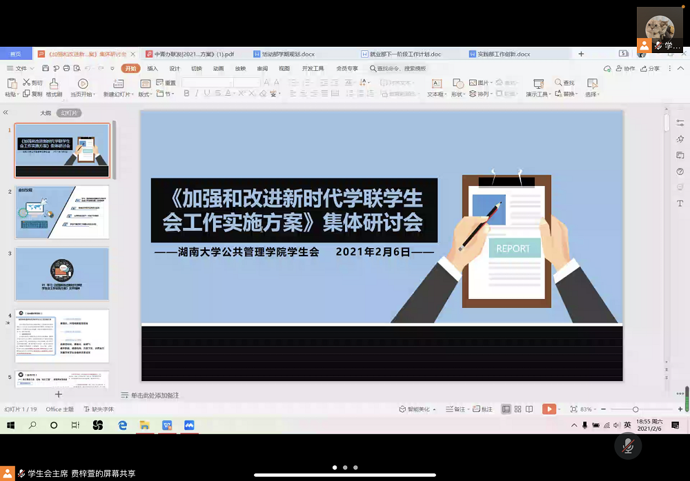 2月6日晚7点,bevictor伟德官网团委、学生会采用线上会议的形式开展《加强和改进新时代学联学生会工作实施方案》集体研讨会。此次会议由学生会主席费梓萱主持,团委、学生会主席团及各部门成员,年级会、班委会成员,国际关系协会、湖湘廉风学社学生代表参加。本次会议主要分为学习《加强和改进新时代学联学生会工作实施方案》文件精神和主席团成员做下一阶段工作规划两部分,旨在回顾本学期工作成果和不足,展望下学期工作规划,以提高各部门工作效率及业务能力。