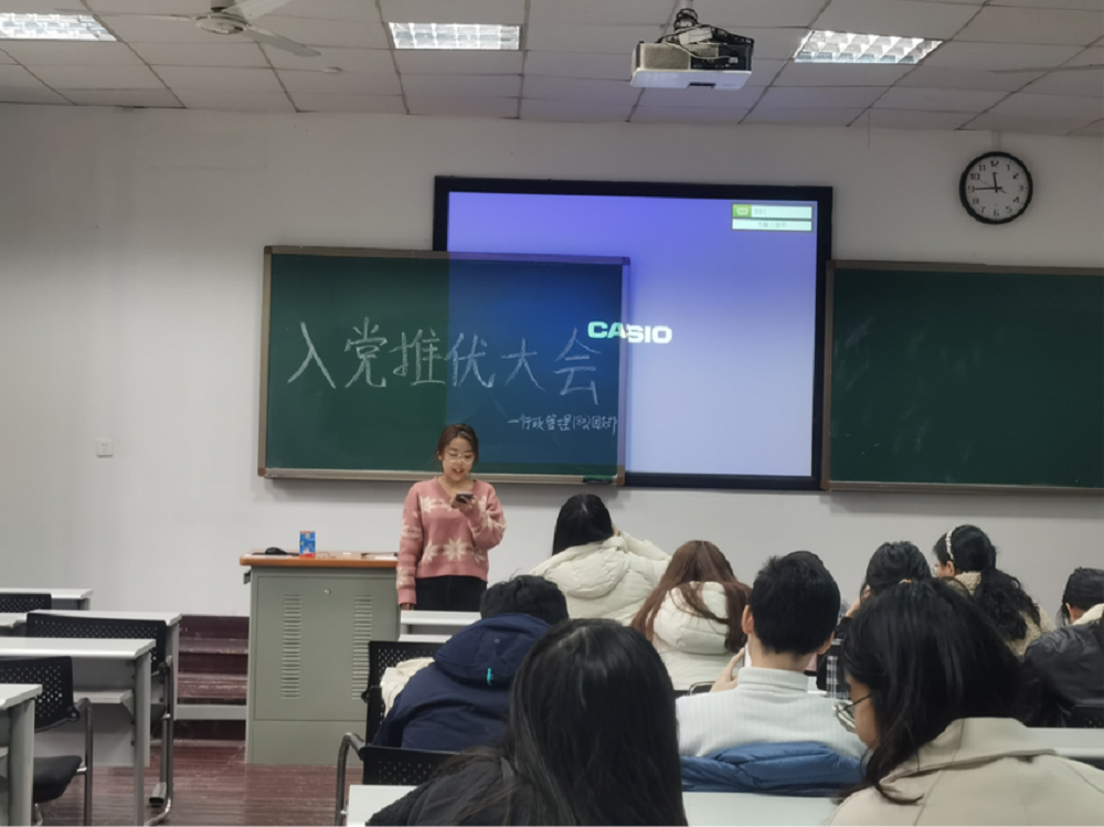 首先,团支书陈欣向大家宣读大会流程、推优条件等相关事宜,明确本次推优完全遵循民主评议的原则,是为了端正团员的思想动机,引导团员更加积极紧密地向党组织靠拢。入党积极分子候选人胡亚辉进行竞选陈述演讲。她表明自己想加入党的态度与原因,对党的理解与认知以及对党的热爱与渴望;同时,她也提出自己未来的发展目标,希望自己在接下来的大学生活中,不断提高、完善自身,做好积极带头作用,向着成为一名优秀共产党员的方向奋斗。
