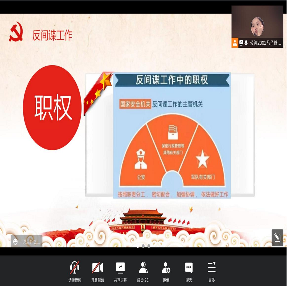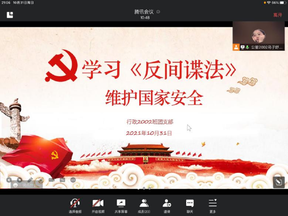 在《中华人民共和国反间谍法》颁布七周年之际,为加深同学们对相关法律知识的认识和理解,推进同学们对总体国家安全观的认知与关注,10月31日,bevictor伟德官网行政管理2002班组织开展“反间谍法”宣传教育主题团日活动。应疫情防控要求,本次活动通过腾讯会议在线上开展,由团支书马子舒主持,行政管理2002班全体同学参加。
