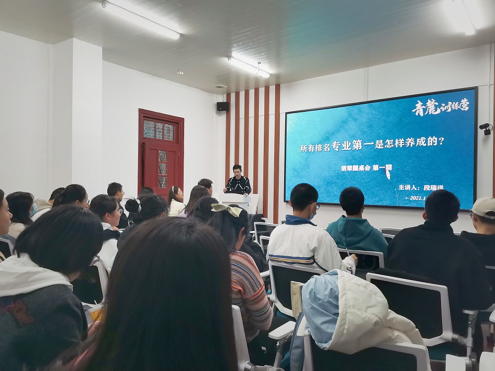 首先,四年全类别综合排名第一并且已顺利保研至北京师范大学的段瑞洋同学对自己以及个人大学经历做了简短介绍后,便引出其分享的核心内容--“大学四年的专业学习应该怎么规划?”他从如何确立小目标讲到如何确立大目标,并详细讲解了保研成绩算法,使大家对四年专业学习有了初步认识。接着,段同学结合其个人经历与经验,告诉大家:参加学生工作只耽误休闲,不耽误学习,“欲戴王冠,必承其重”,同学们不妨大胆承担,锻炼自我。