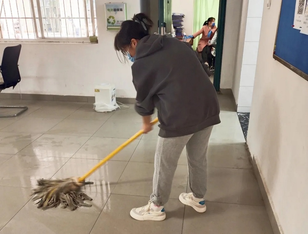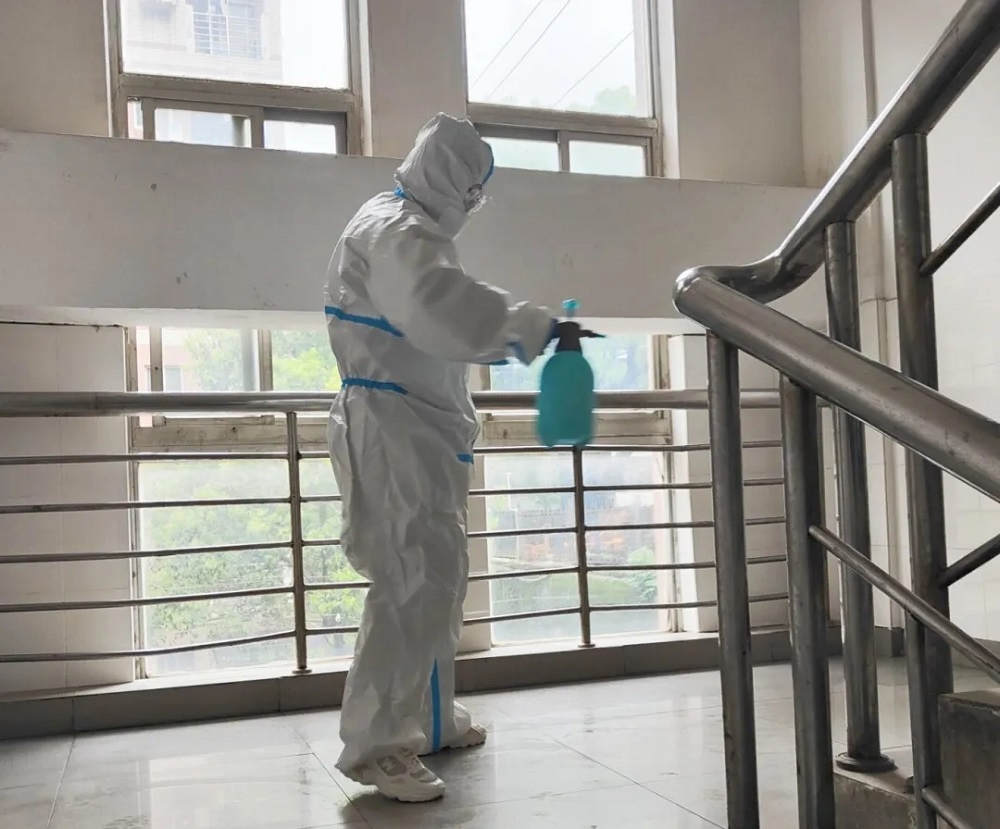 食堂配餐志愿者、楼道消杀志愿者徐忠莉同学说道:“去食堂装饭时真的有体会到工作人员的辛苦,起那么早,装几百上千份饭,一刻也不能闲着,早饭后紧接着午饭,看上去容易,等到自己上手才能体会到非常不容易!穿防护服消杀全楼,我们四个人从一楼到四楼,角角落落都要喷84消毒液。而且因为喷壶太小,要往返楼层装消毒水,从一楼穿防护服爬上楼,总有种喘不上气的感觉,真的很热:我们只穿了大概一小时,脱下来后发现头发都有些湿了,那些防护人员一穿便是四五个小时,更不容易了!”
