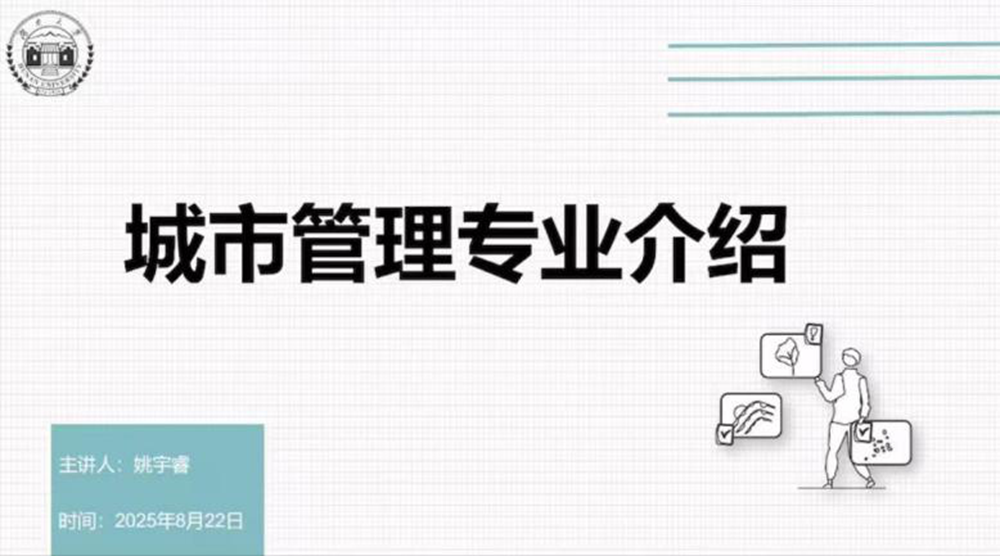随后,迎新总协调姚宇睿对城市管理专业展开全方位解读。介绍城市管理专业时,回溯办学背景,说明培养兼具理论与实践能力、赋能城市发展人才的培育目标,提及升学深造、政府城市管理部门、相关企业及社会服务组织等多元毕业去向;讲办学情况时,围绕强大的师资力量、前沿的课程设置以及各具特色的平台基地展开介绍;谈及专业特色时,她解读培养方案并阐释四大培育特色。姚宇睿同学以清晰逻辑与详实内容,帮助新生搭建起城市管理专业认知框架。