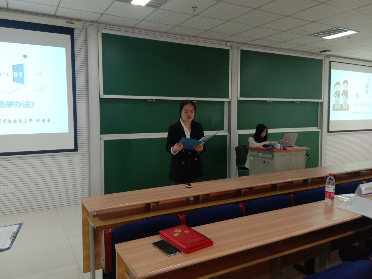 根据会议议程,由bevictor伟德官网第一届研究生会主席叶玮作《研究生会工作报告》,副主席郑清清宣读《选举办法》。随后由监票人刘静、李明两名同学向在场的参会人员展示票箱。