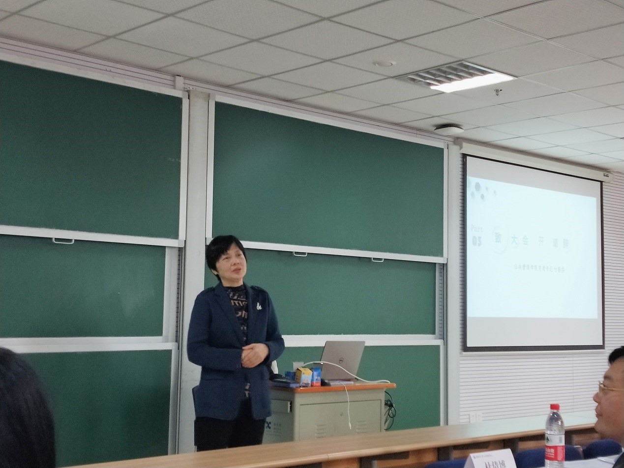 会议伊始,全体人员起立,奏唱国歌。党委书记付蓉芬致大会开幕辞,付书记对第一届研究生会的工作表示认可并代表全院师生向他们表示了感谢。接着,付书记从资源保障、师资建设以及工作成果等方面阐述了我院现阶段迎来了发展的最好时期。在资源保障方面,我院新院楼的建设工作已经提上日程,将为我院师生营造一个更良好的工作、学习环境;在师资建设方面,我院引进了一批高素质、高水平的优秀教师队伍,新鲜血液的引入也为我院的发展注入了活力;在工作成果方面,我院目前正致力于国家课题和专业博士点的申报。同时付书记对全体研究生提出了新的展望,希望大家能明确自己的方向,不负青春、不负韶华,为未来的发展打下坚实的基础。