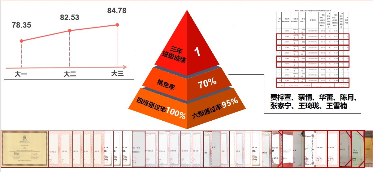 学风建设上,行管1801班通过建立辅导员、班主任、朋辈合力机制,充分发挥传递、帮助、带动作用,取得了优异的成绩,班级平均成绩连续三年位列年级第一,获推免资格人数占专业指标70%,四级通过率达100%,六级通过率达95%;班级同学踊跃参与各类学术竞赛,其中5人获国家级奖项,17人获校院级荣誉。